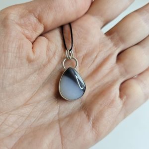Colgante de plata 925 con piedra natural Merlinita en forma de gota y detalle de corazón calado en el reverso. Una joya artesanal llena de simbolismo, equilibrio y energía natural.