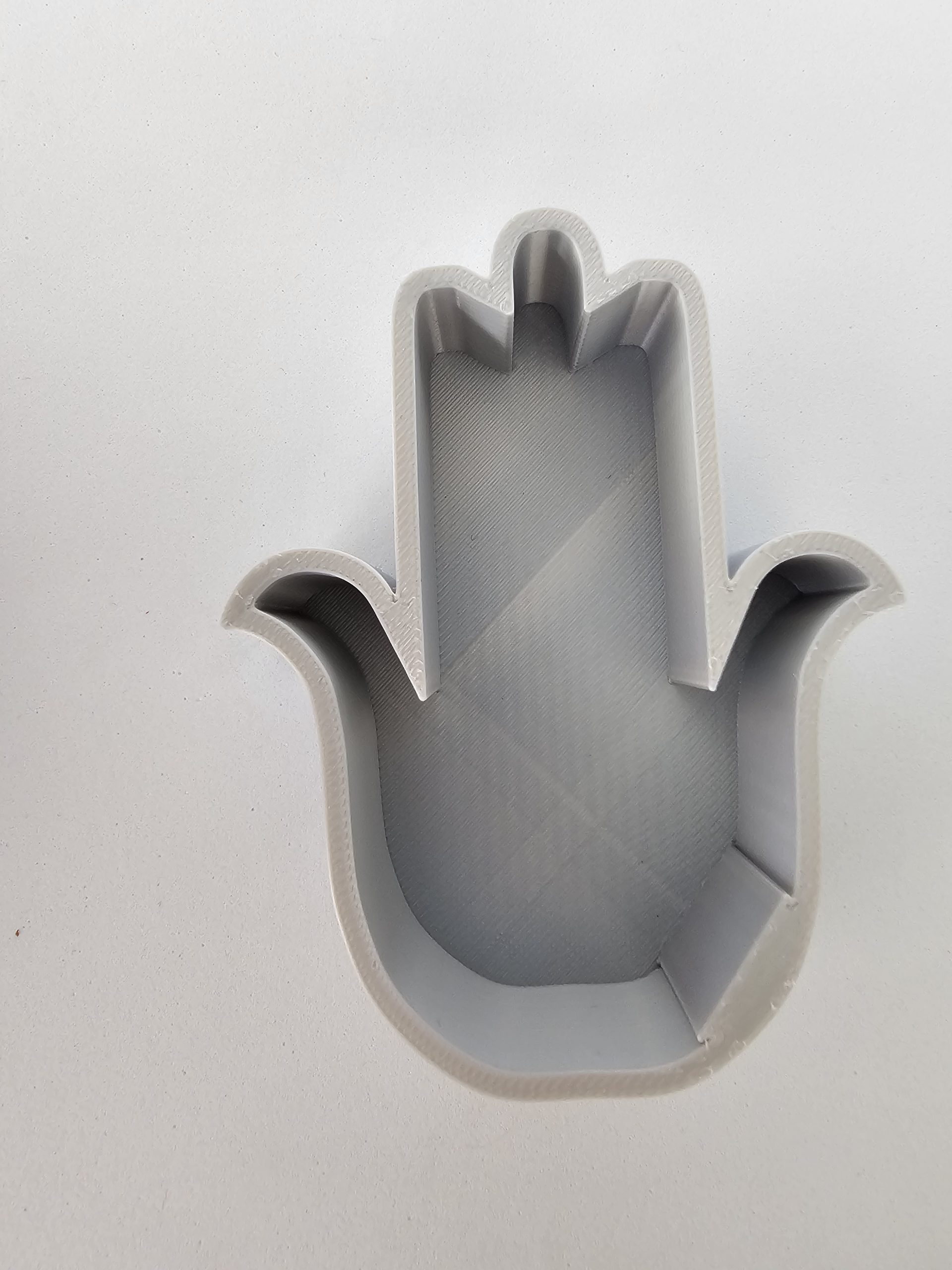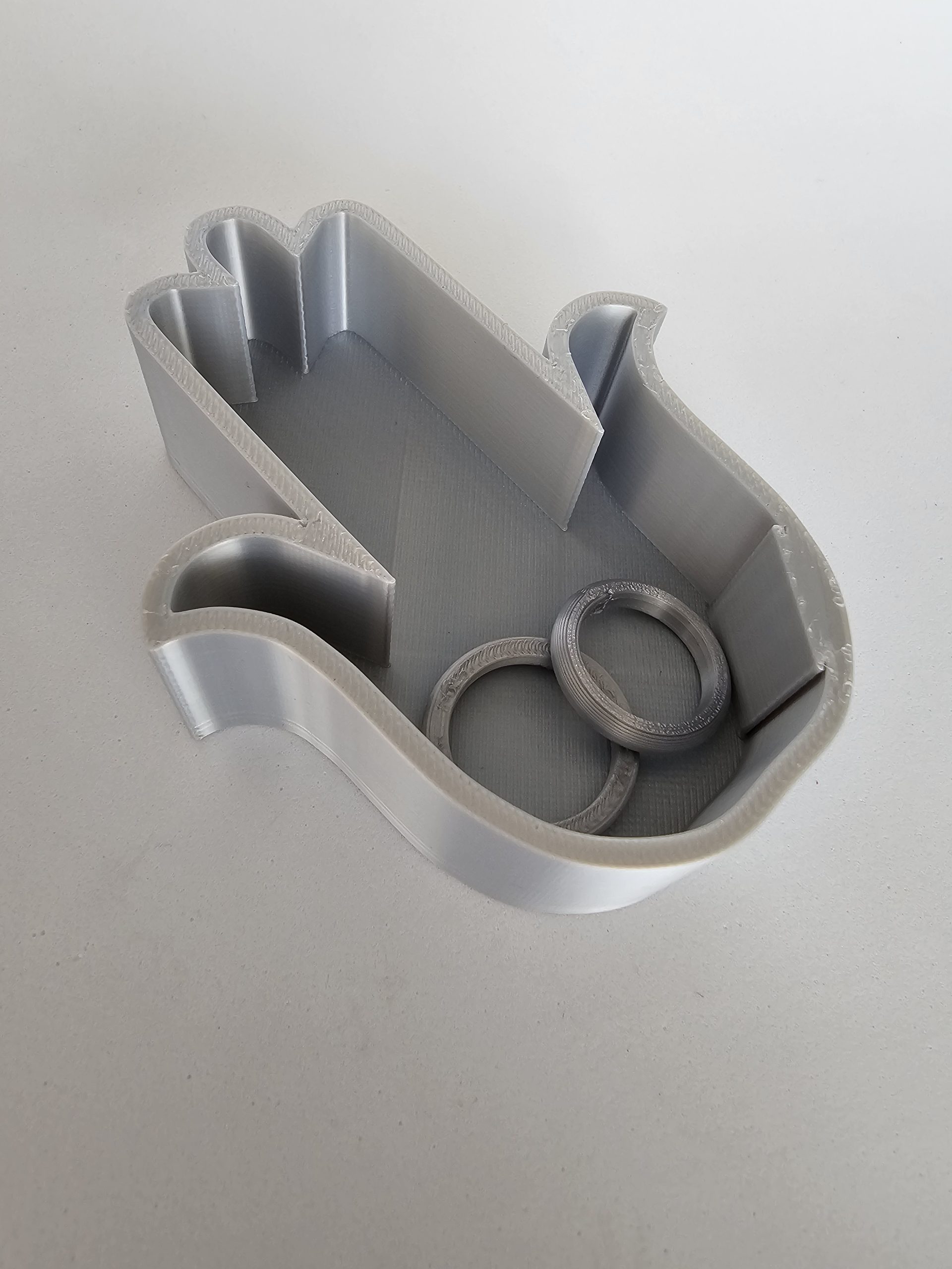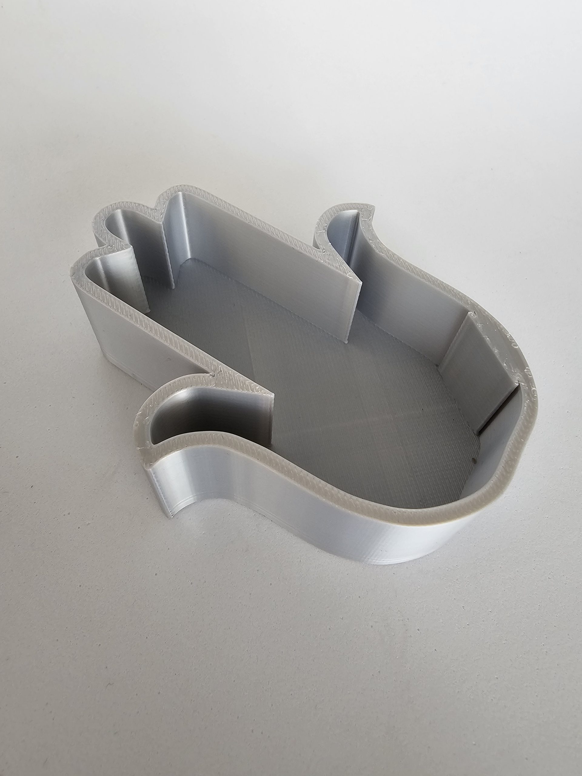 Cajita joyero sin tapa en forma de Mano de Fátima (Hamsa) plateada, impresa en 3D. Perfecta como vaciabolsillo para dejar joyas, llaves o pequeños objetos con estilo y protección simbólica.